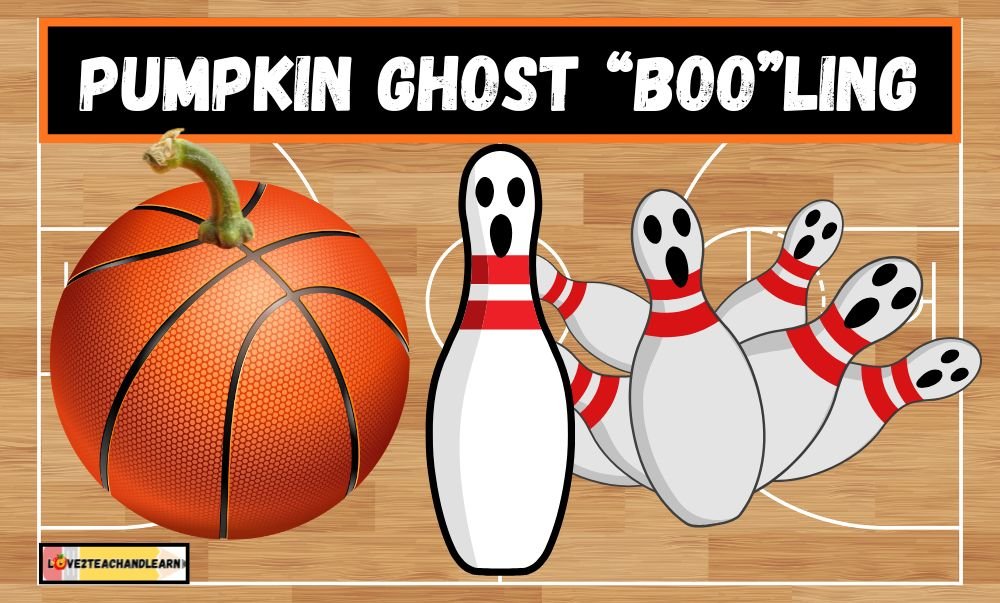 PE STATION SET-UP: First, using a black dry erase marker, draw a fun ghost face on your white bowling pins, Next, grab an orange basketball to use as your pumpkin (bowling ball). FINALLY, set the ten pins up in a pyramid (4-3-2-1) formation – just like regular bowling.