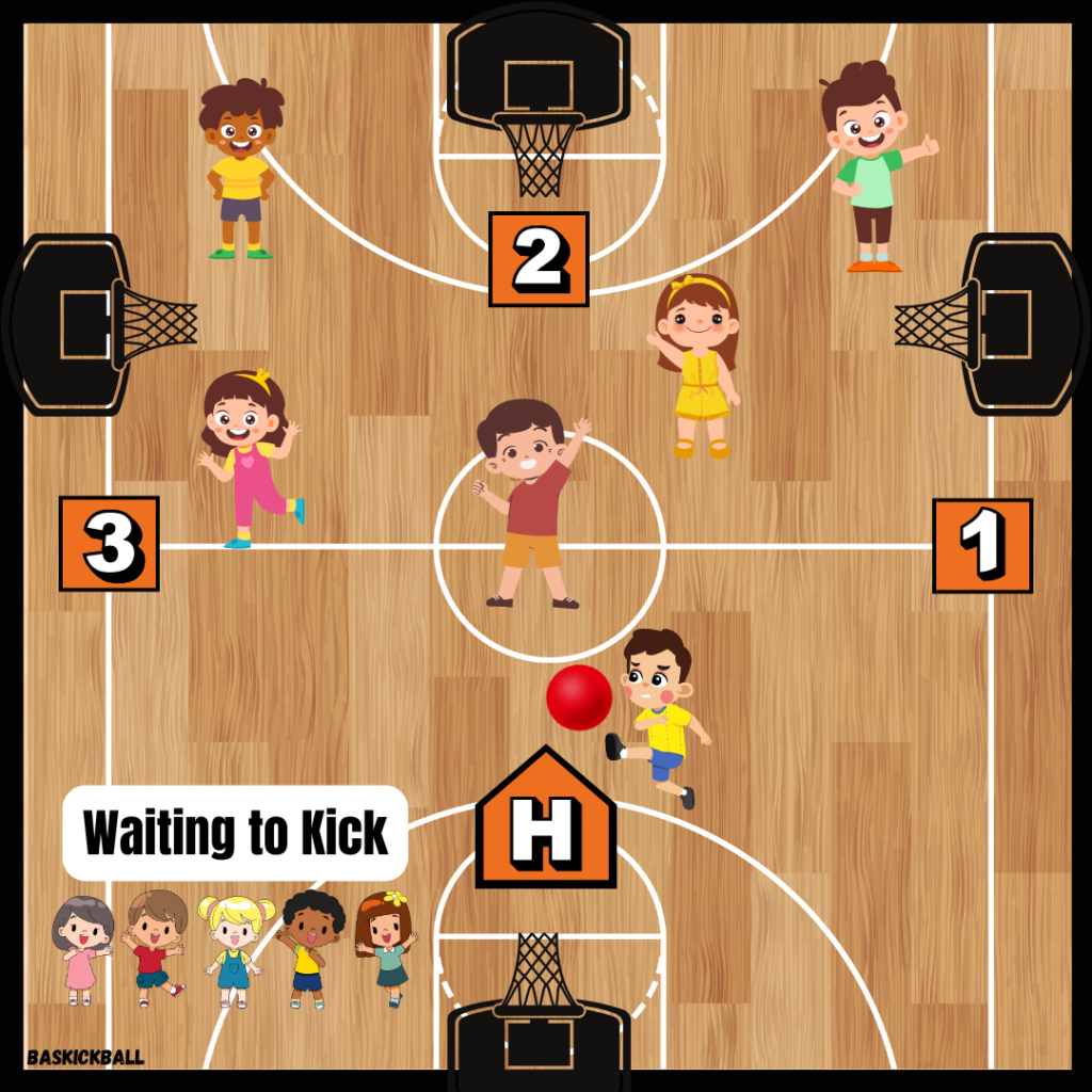 The kicker kicks the ball and MUST attempt to touch all of the bases and score a run. They CAN NOT stop at any base – it’s all or nothing in this game.